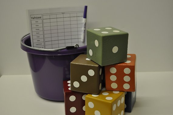 Yard dice with storage bucket. Comes with a dry erease score card for Yatzee and Farkle. Dice are approximately 4 inch cubes.